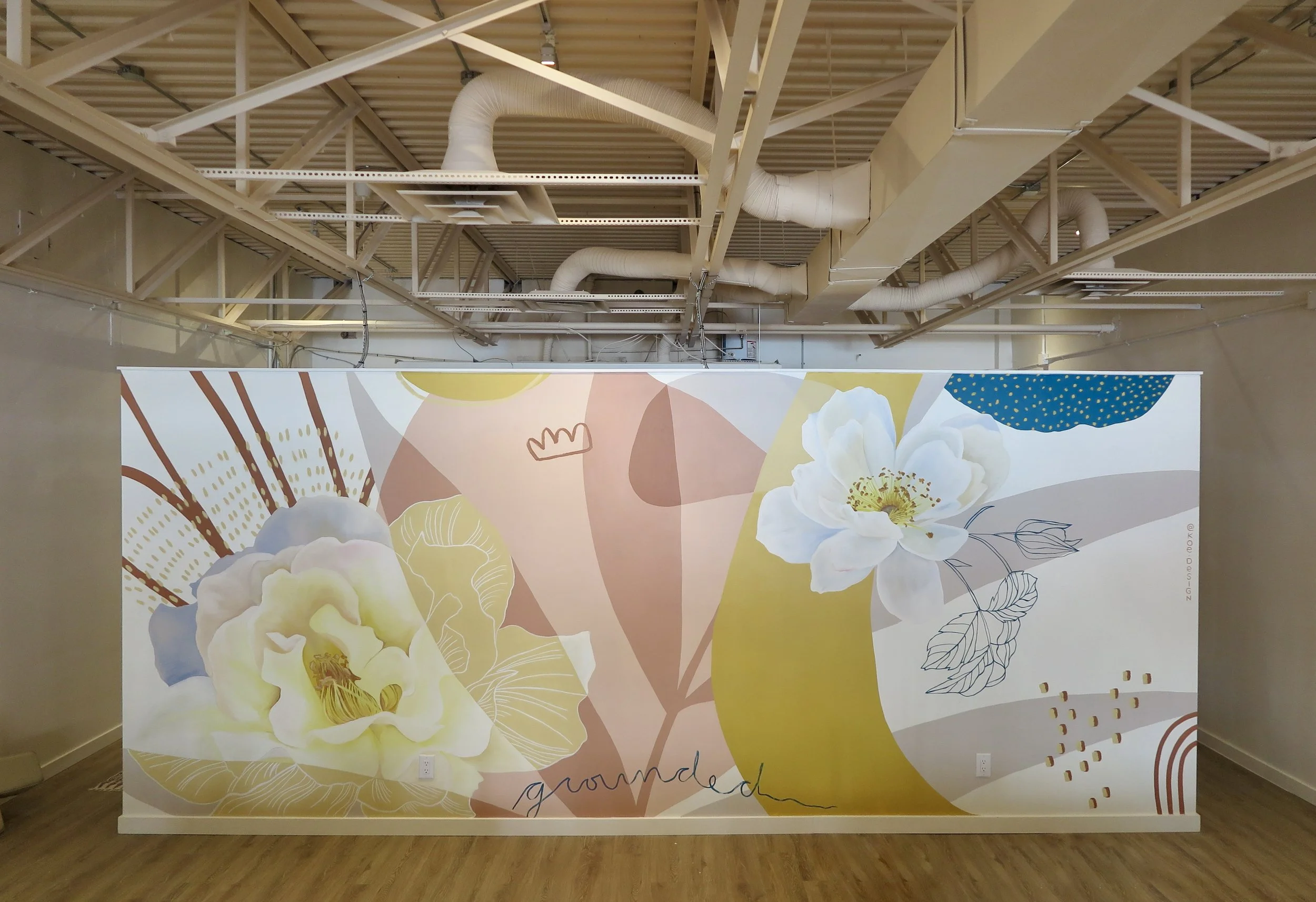 Located in downtown Burlington, this open concept Pilates studio needed a bright, grounding focal point on its main wall. We crafted a soft bohemian color palette that beautifully complements the existing brand colors. This mural has since become a defining element of Grounded Pilates’ identity, serving as an inspiring and calming backdrop for every class.